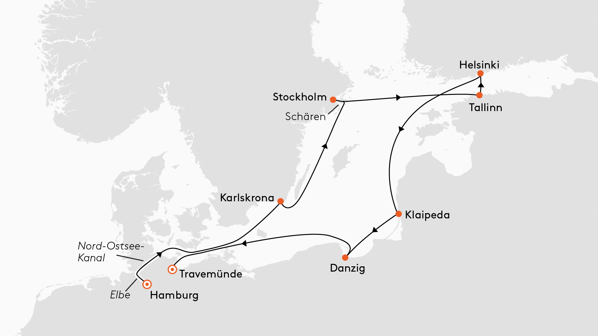 Die Route führt uns zu den schönsten Städten und Landschaften der Ostsee. Allein die Fahrt durch die Schären von Stockholm macht diese Reise unvergesslich. Ein weiterer Höhepunkt ist die Fahrt durch den Nord-Ostsee-Kanal gleich zu Beginn der Reise.