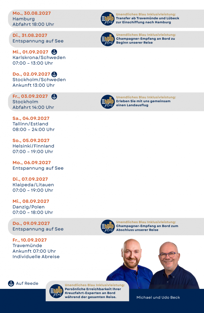 - Persönliche Begleitung durch Udo und Michael Beck – Ihre Kreuzfahrt-Experten aus Travemünde