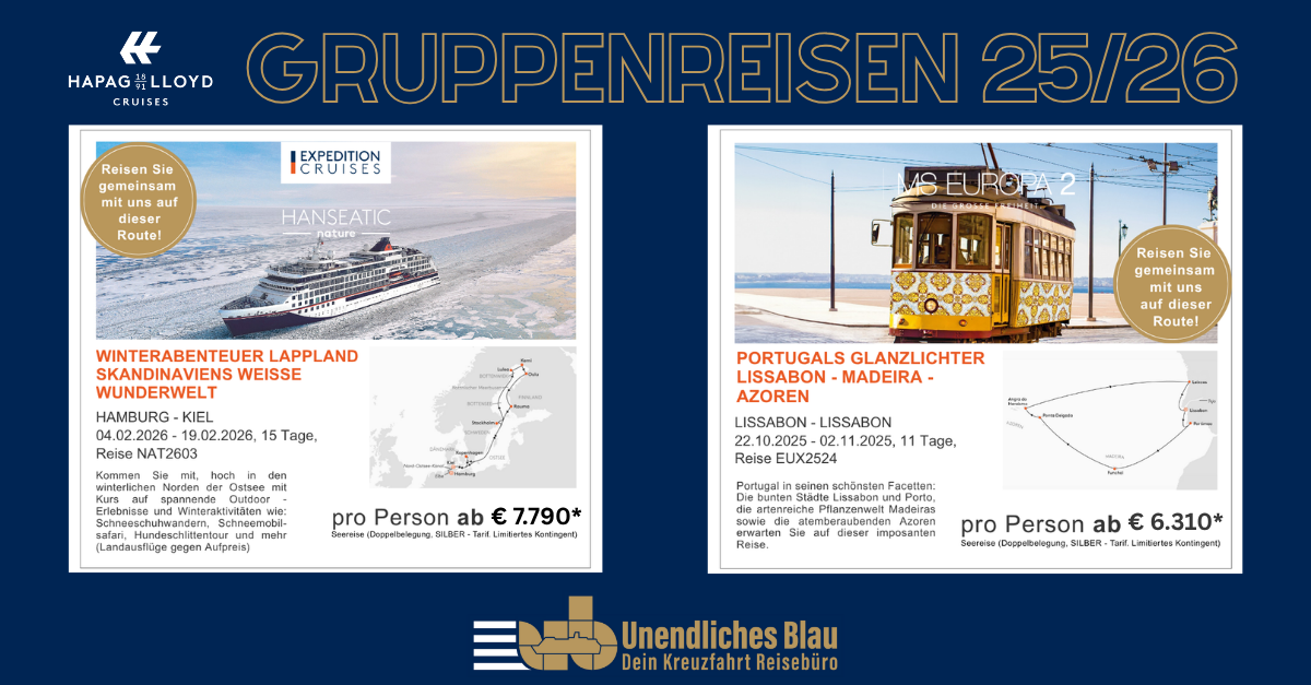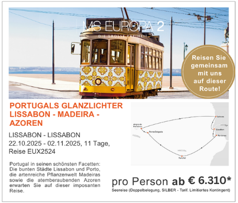 Im Oktober 2025 nimmt dich die EUROPA 2, eines der luxuriösesten Kreuzfahrtschiffe der Welt, mit auf eine stilvolle Reise entlang der portugiesischen Küste – bis zu den magischen Inselwelten von Madeira und den Azoren. Sanfte Wellen, elegante Tage auf See, inspirierende Landgänge: Diese Kreuzfahrt ist eine Einladung zum Durchatmen, Entdecken und Genießen.