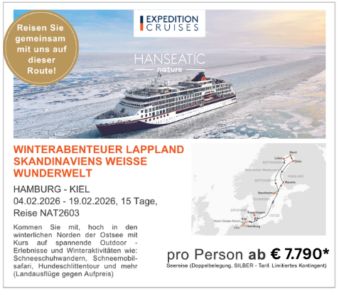 Im Februar 2026 erwartet dich ein Abenteuer, das nur wenige je erleben: Eine Expeditions-Kreuzfahrt durch die vereiste Ostsee, hinein in die unberührte Winterwelt des hohen Nordens – bis nach Lappland. Polarlichter flackern über dem Himmel, Schneelandschaften erstrecken sich bis zum Horizont, und in stillen Momenten spürst du, wie du eins wirst mit der Natur.