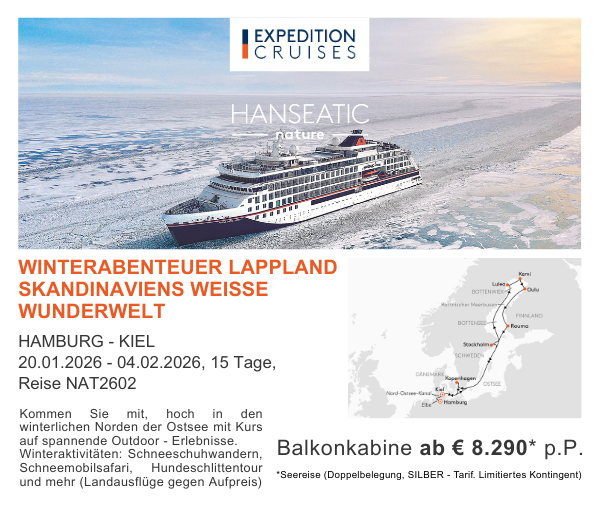 Im Februar 2026 erwartet dich ein Abenteuer, das nur wenige je erleben: Eine Expeditions-Kreuzfahrt durch die vereiste Ostsee, hinein in die unberührte Winterwelt des hohen Nordens – bis nach Lappland. Polarlichter flackern über dem Himmel, Schneelandschaften erstrecken sich bis zum Horizont, und in stillen Momenten spürst du, wie du eins wirst mit der Natur. Und wenn die Bedingungen es zulassen, kannst du das Schiff auf dem offenen Meer auf der Eisdecke zu Fuß verlassen – ein wirklich einmaliges Erlebnis.